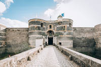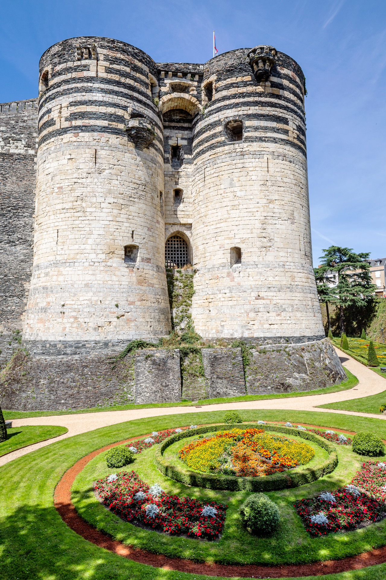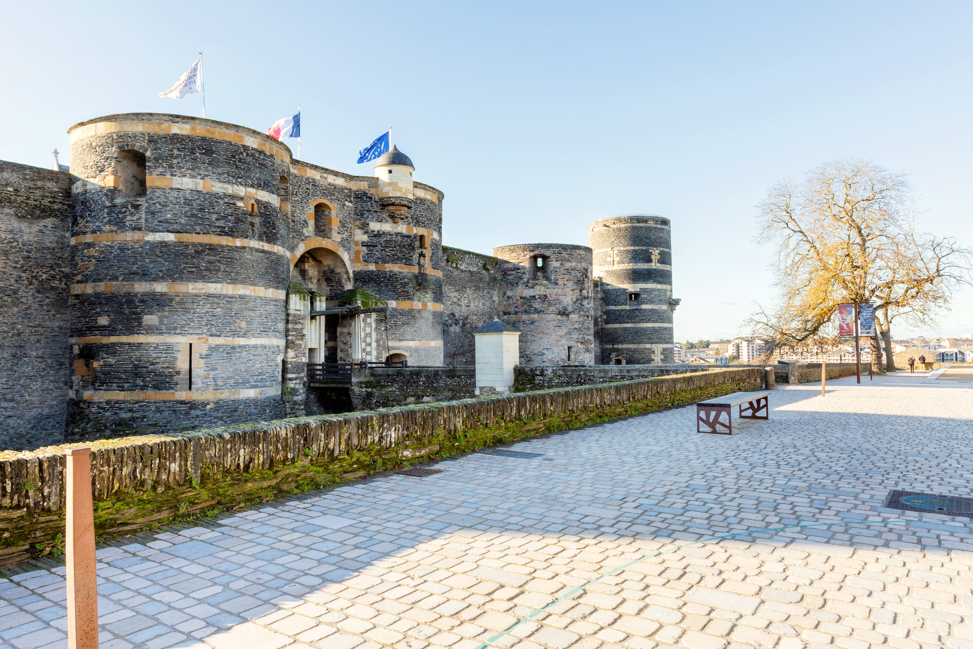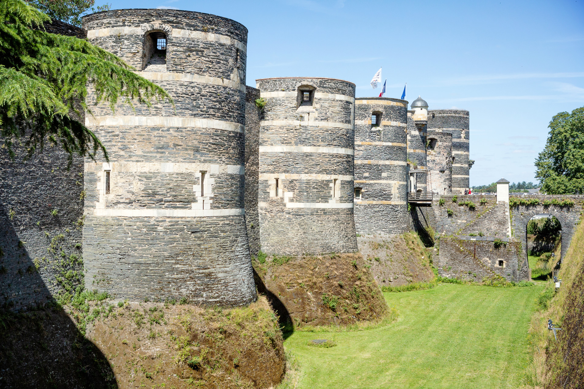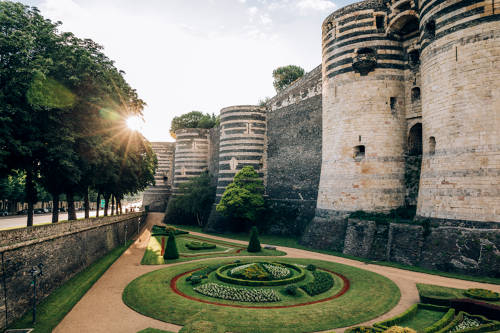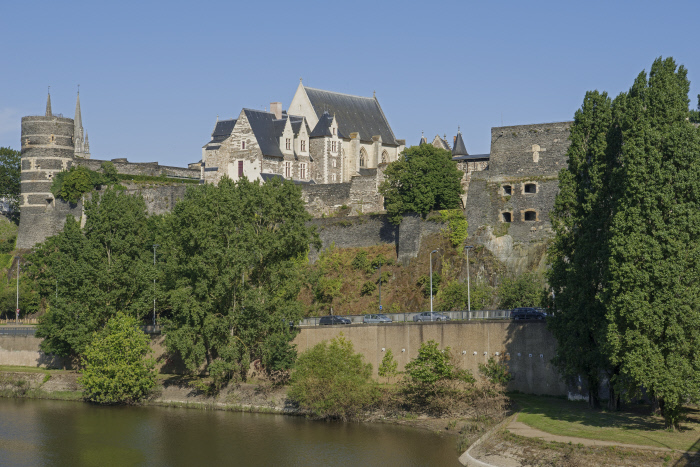 Sur un promontoire rocheux dominant la Maine, le château d’Angers est un monument impressionnant qui possède une très riche histoire. Sur ces terres, se sont en effet succédé une sépulture néolithique, un oppidum gaulois, le coeur de la ville romaine et un vaste palais comtal roman. Au XIIIe siècle, la mère du Roi Saint Louis, Blanche de Castille, y fait édifier une gigantesque enceinte d’un demi-kilomètre scandée de dix-sept tours de schiste et de calcaire. Il se dégage de cette forteresse une formidable impression de puissance et son architecture militaire élaborée la rend quasi imprenable. Toutefois, les adaptations du château à l’évolution de l’artillerie, son usage de prison et de caserne ont entraîné la disparition de certains bâtiments médiévaux. Du haut des remparts, sur le chemin de ronde, le panorama sur la ville est absolument unique.