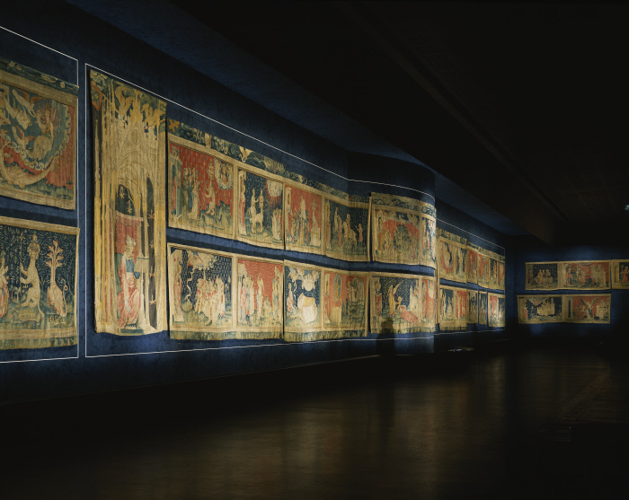 De par ses dimensions -100 mètres de long-, son ancienneté et sa virtuosité stylistique et technique, la tapisserie de l’Apocalypse est un chef d’oeuvre extraordinaire de l’art médiéval, unique au monde. Commandée à la fin du XIVe siècle par Louis Ier, réalisée en un temps record, elle est composé de six pièces constituées chacune de quatorze scènes sur deux registres. Le peintre du roi Jean de Bruges est l’auteur des cartons de ce joyau inestimable. Œuvre considérable destinée à impressionner les proches du prince, elle illustre le texte de l’Apocalypse de Saint Jean, dernier livre de la Bible. Cette tapisserie est aussi un formidable document sur le contexte historique, social et politique de sa création marqué notamment par la Guerre de Cent Ans. Elle appartient au plus grand trésor de tapisseries de cathédrale d’Europe, comportant plus de cent pièces, qui est conservé au château.