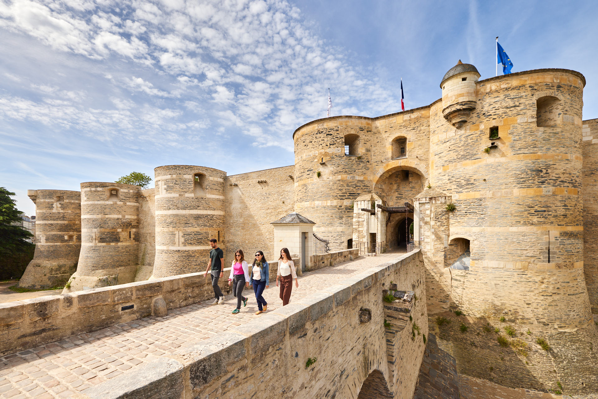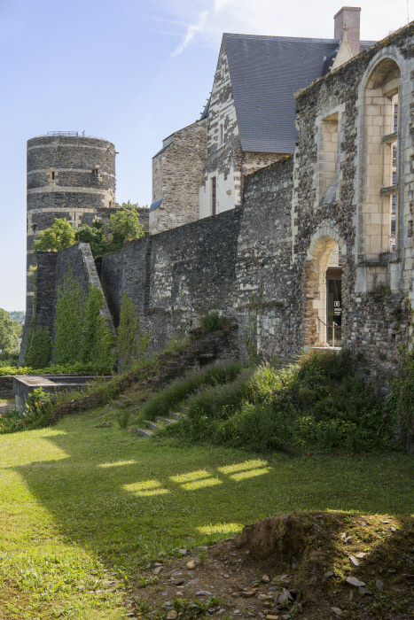 Sur un promontoire rocheux dominant la Maine, le château d’Angers est un monument impressionnant qui possède une très riche histoire. Sur ces terres, se sont en effet succédé une sépulture néolithique, un oppidum gaulois, le coeur de la ville romaine et un vaste palais comtal roman. Au XIIIe siècle, la mère du Roi Saint Louis, Blanche de Castille, y fait édifier une gigantesque enceinte d’un demi-kilomètre scandée de dix-sept tours de schiste et de calcaire. Il se dégage de cette forteresse une formidable impression de puissance et son architecture militaire élaborée la rend quasi imprenable. Toutefois, les adaptations du château à l’évolution de l’artillerie, son usage de prison et de caserne ont entraîné la disparition de certains bâtiments médiévaux. Du haut des remparts, sur le chemin de ronde, le panorama sur la ville est absolument unique.