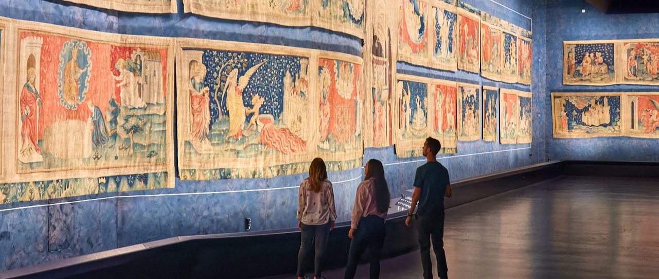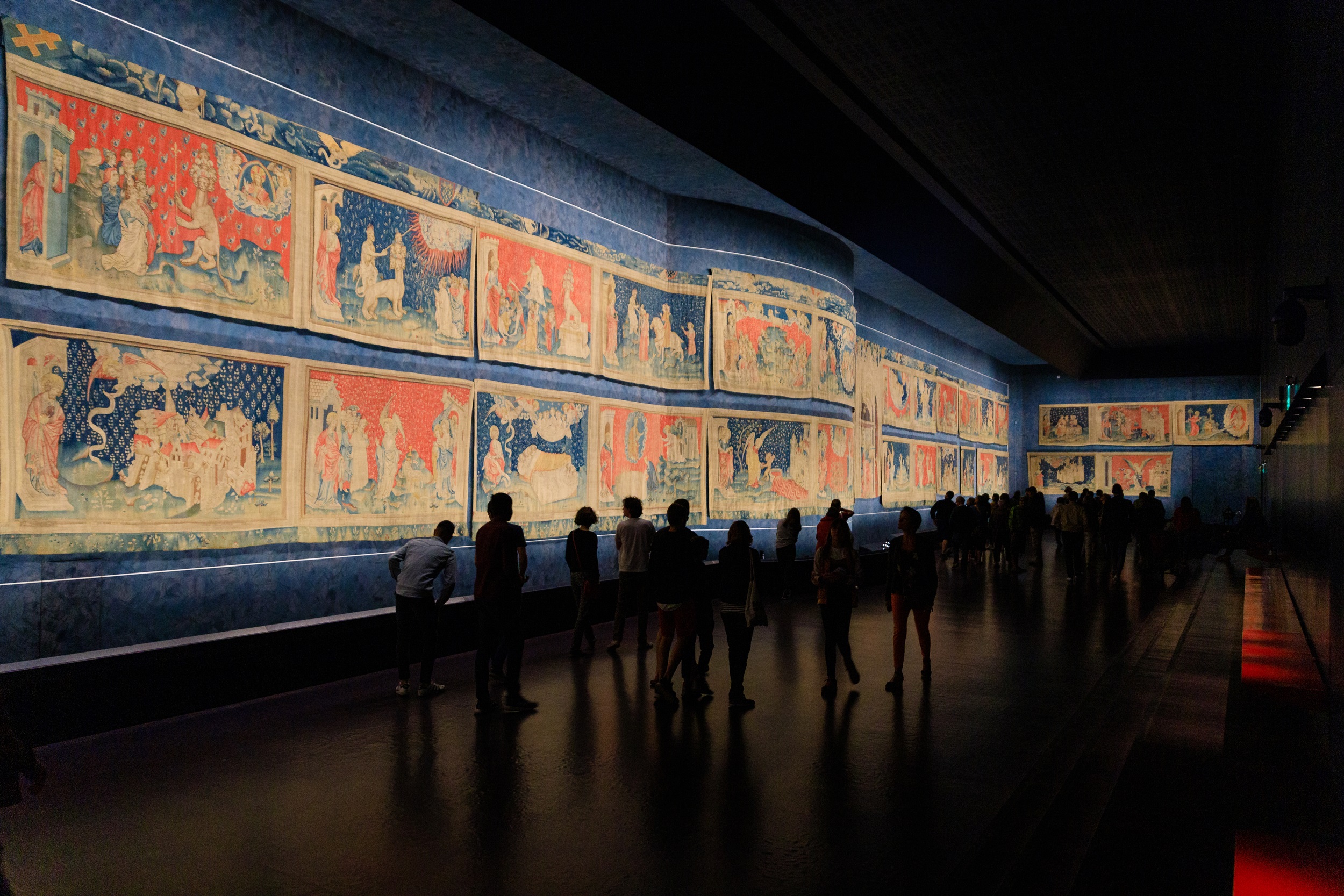 De par ses dimensions -100 mètres de long-, son ancienneté et sa virtuosité stylistique et technique, la tapisserie de l’Apocalypse est un chef d’oeuvre extraordinaire de l’art médiéval, unique au monde. Commandée à la fin du XIVe siècle par Louis Ier, réalisée en un temps record, elle est composé de six pièces constituées chacune de quatorze scènes sur deux registres. Le peintre du roi Jean de Bruges est l’auteur des cartons de ce joyau inestimable. Œuvre considérable destinée à impressionner les proches du prince, elle illustre le texte de l’Apocalypse de Saint Jean, dernier livre de la Bible. Cette tapisserie est aussi un formidable document sur le contexte historique, social et politique de sa création marqué notamment par la Guerre de Cent Ans. Elle appartient au plus grand trésor de tapisseries de cathédrale d’Europe, comportant plus de cent pièces, qui est conservé au château.