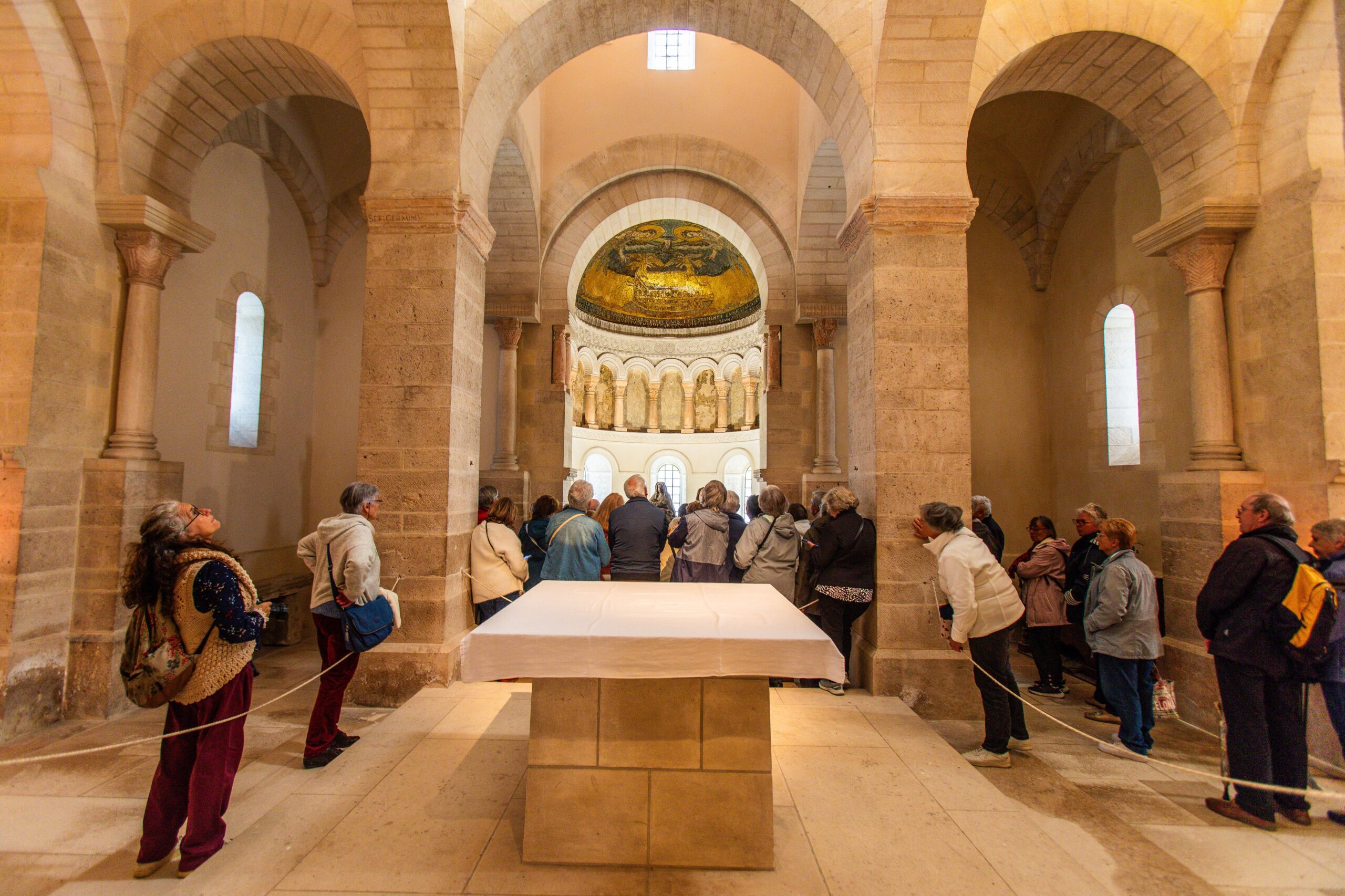 On raconte que ce sont des enfants du village qui ont permis de retrouver la mosaïque : ils jouaient avec des « cubes de verre » trouvés dans l’église. Au XIXe siècle, les archéologues ont pu mettre à jour cette impressionnante mosaïque du IXe siècle. C’est l’une des plus anciennes de France.